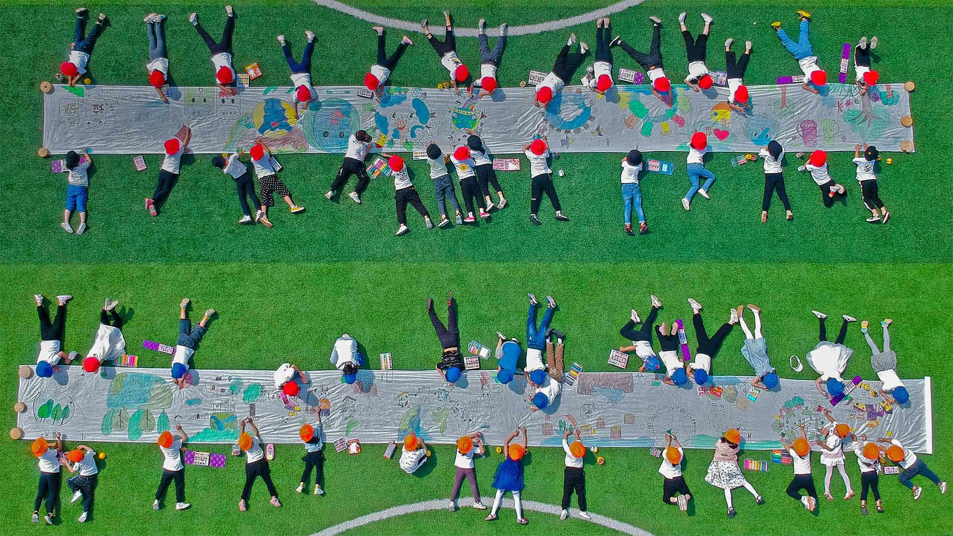 Kindergarteners drawing on canvases in Nantong, Jiangsu province, 中国 (© Xu Hui/VCG via 盖蒂图片社)