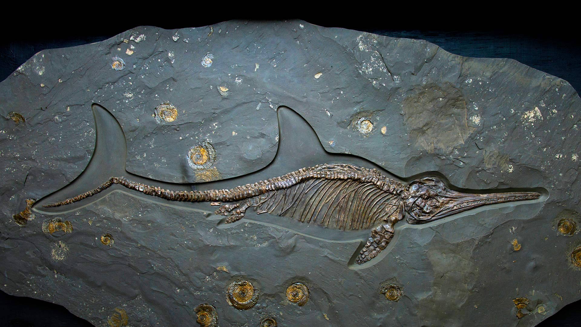An ichthyosaur fossil of the Jurassic period, Dinosaurland Fossil Museum, Lyme Regis, 多塞特, 英格兰 (© Christopher Jones/Alamy)