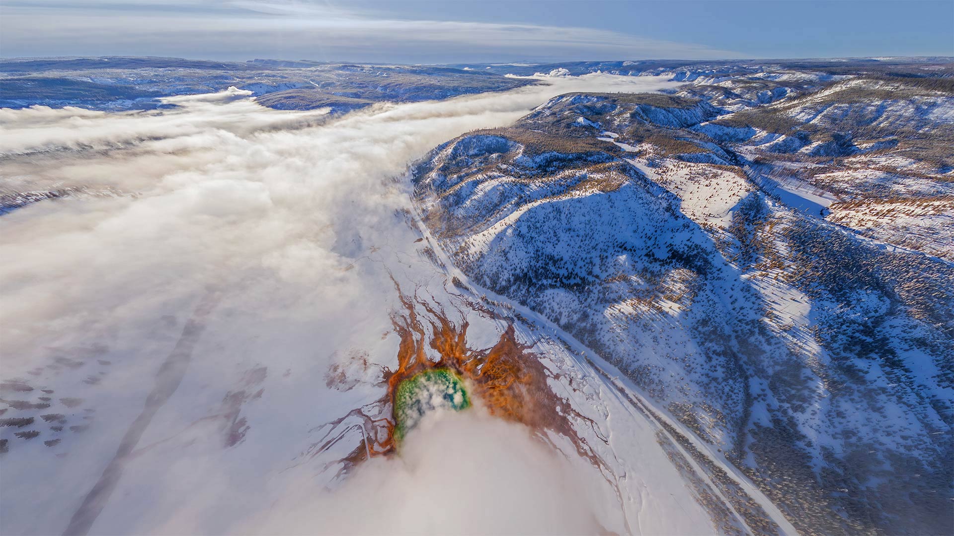 Aerial view of Grand Prismatic Spring, 黄石公园 National Park, 怀俄明州 (© AirPano LLC/Amazing Aerial Agency)